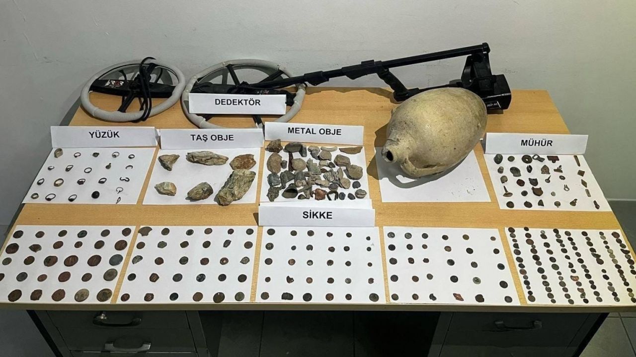 Şüphelinin ikametindeki aramada, tarihi eser niteliği taşıdığı değerlendirilen 250 sikke, 201 taş obje, 150 metal obje, 28 yüzük, 24 mühür ve 1 küp ile alan tarama cihazı ele geçirildi.