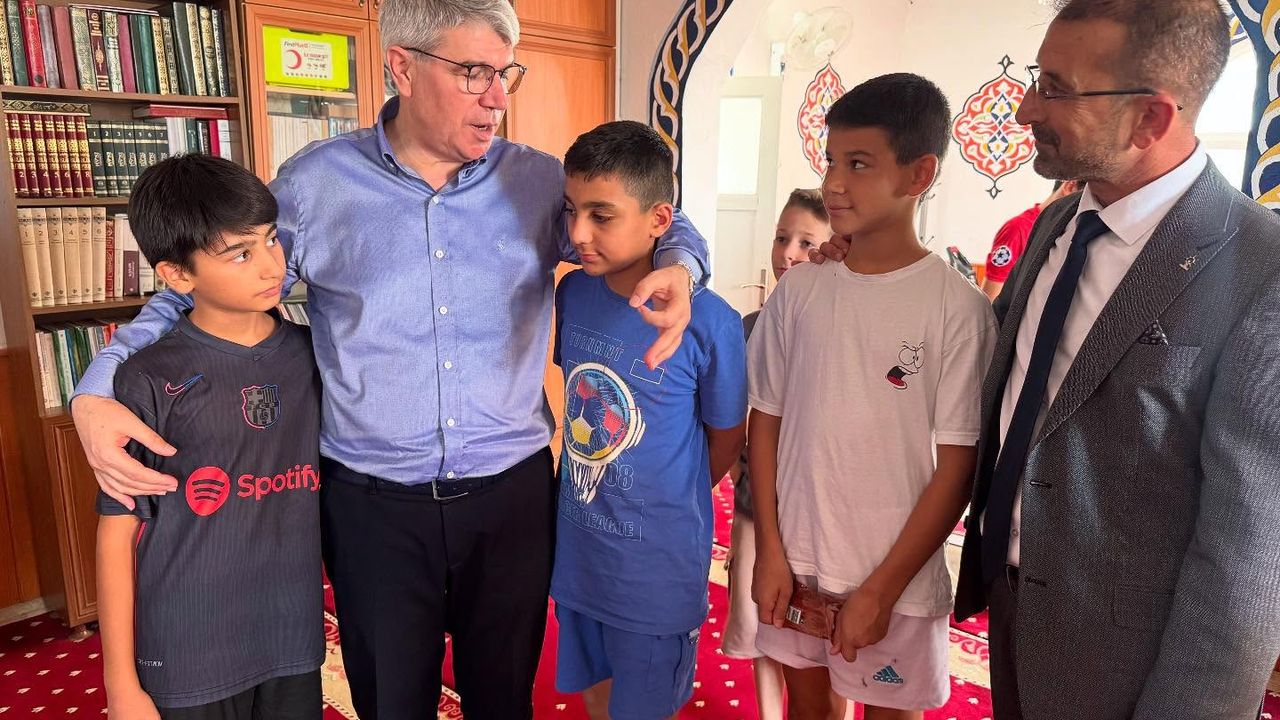 Muhammediye Camii Kur’an Kursu’nda eğitim gören çocuklarla bir araya gelen heyet, Kur’an-ı Kerim’e geçen öğrencileri dinleyerek tebrik etti.