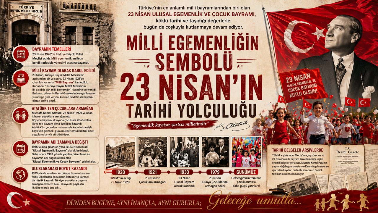 Türkiye’nin en anlamlı milli bayramlarından biri olan 23 Nisan Ulusal Egemenlik ve Çocuk Bayramı, köklü tarihi ve taşıdığı değerlerle bugün de coşkuyla kutlanmaya devam ediyor. Bayramın temelleri, Türkiye Büyük Millet Meclisi’nin açılışına dayanıyor.