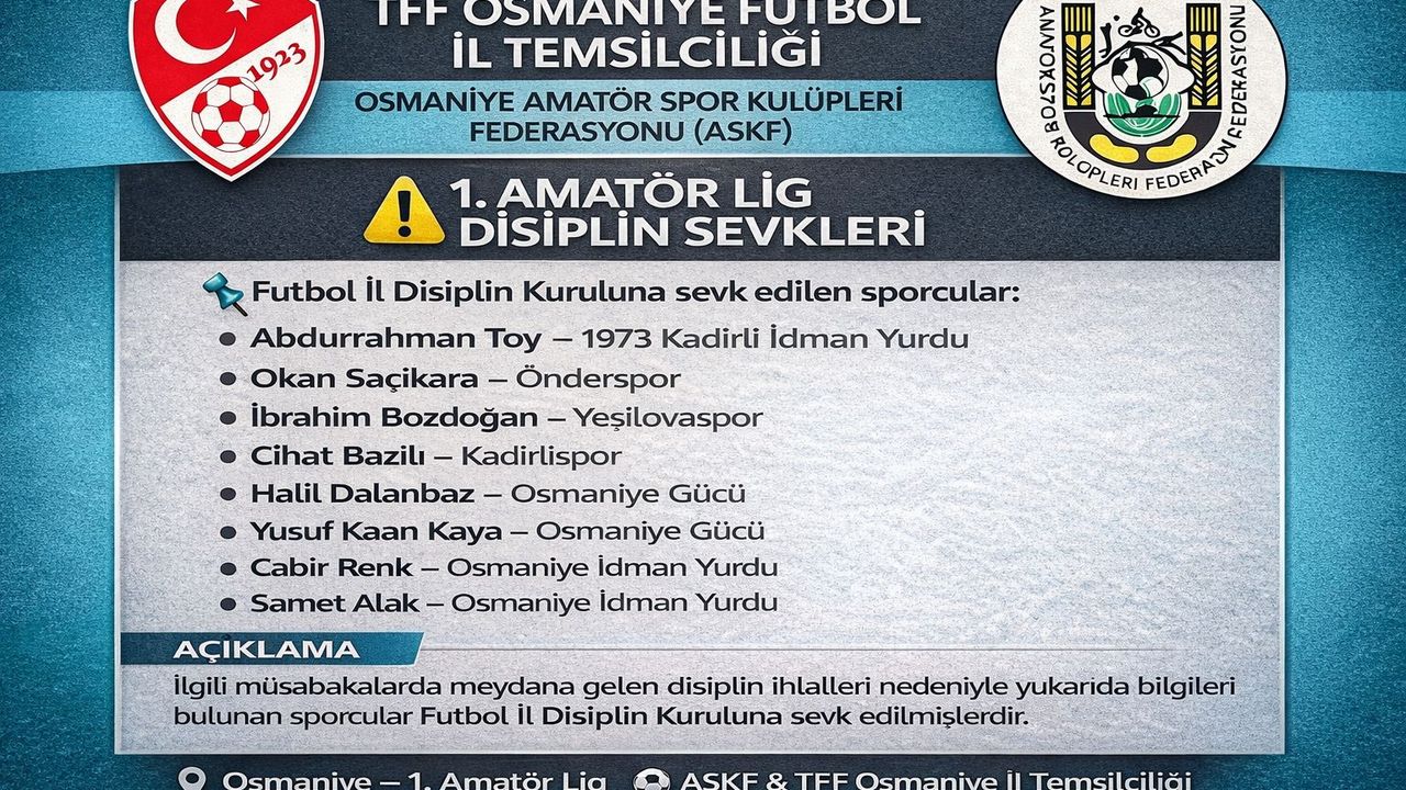 TFF Osmaniye Futbol İl Temsilciliği ve Osmaniye Amatör Spor Kulüpleri Federasyonu (ASKF) tarafından yapılan açıklamada, 1. Amatör Lig’de oynanan müsabakalarda disiplin ihlallerinde bulunan sporcuların Futbol İl Disiplin Kurulu’na sevk edildiği duyuruldu.