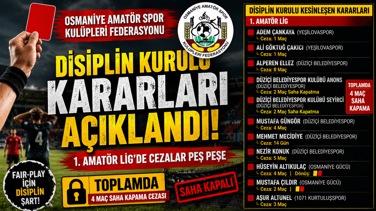Disiplin kurulunun aldığı bu kararlar, Osmaniye amatör liglerinde fair-play ve saha disiplini açısından önemli bir mesaj olarak değerlendiriliyor. Önümüzdeki haftalarda takımların sahadaki davranışları daha yakından takip edilecek.
