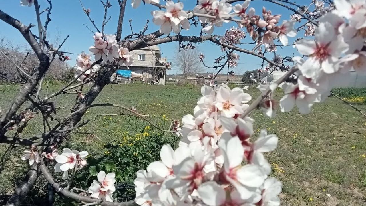 Fotoğraflarda, kırsal alandaki badem ağaçlarının dolu dolu çiçek açtığı, arka planda köy evlerinin ve seraların yer aldığı görülüyor. Köy sakinleri, bu dönemi verimli bir yılın habercisi olarak değerlendiriyor ve çiçek açan ağaçların ilerleyen aylarda bol ürün vereceğini umut ediyor.
