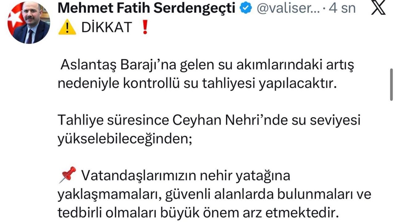 “Tahliye süresince Ceyhan Nehri’nde su seviyesi yükselebileceğinden; vatandaşlarımızın nehir yatağına yaklaşmamaları, güvenli alanlarda bulunmaları ve tedbirli olmaları büyük önem arz etmektedir.”