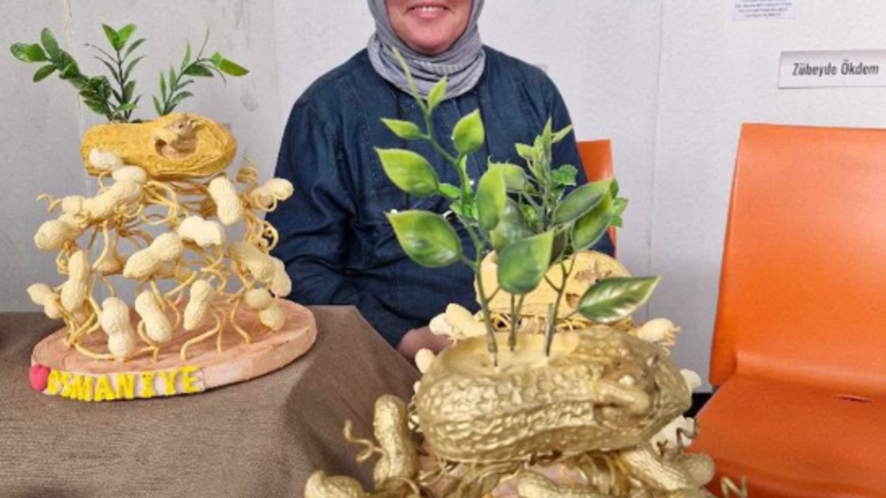 Adana’da düzenlenen Sanat Fuarı’na Osmaniye’den katılan Elife Toprak, yöresel ürünlerden ilham alarak hazırladığı yerfıstığı maketiyle dikkat çekti.