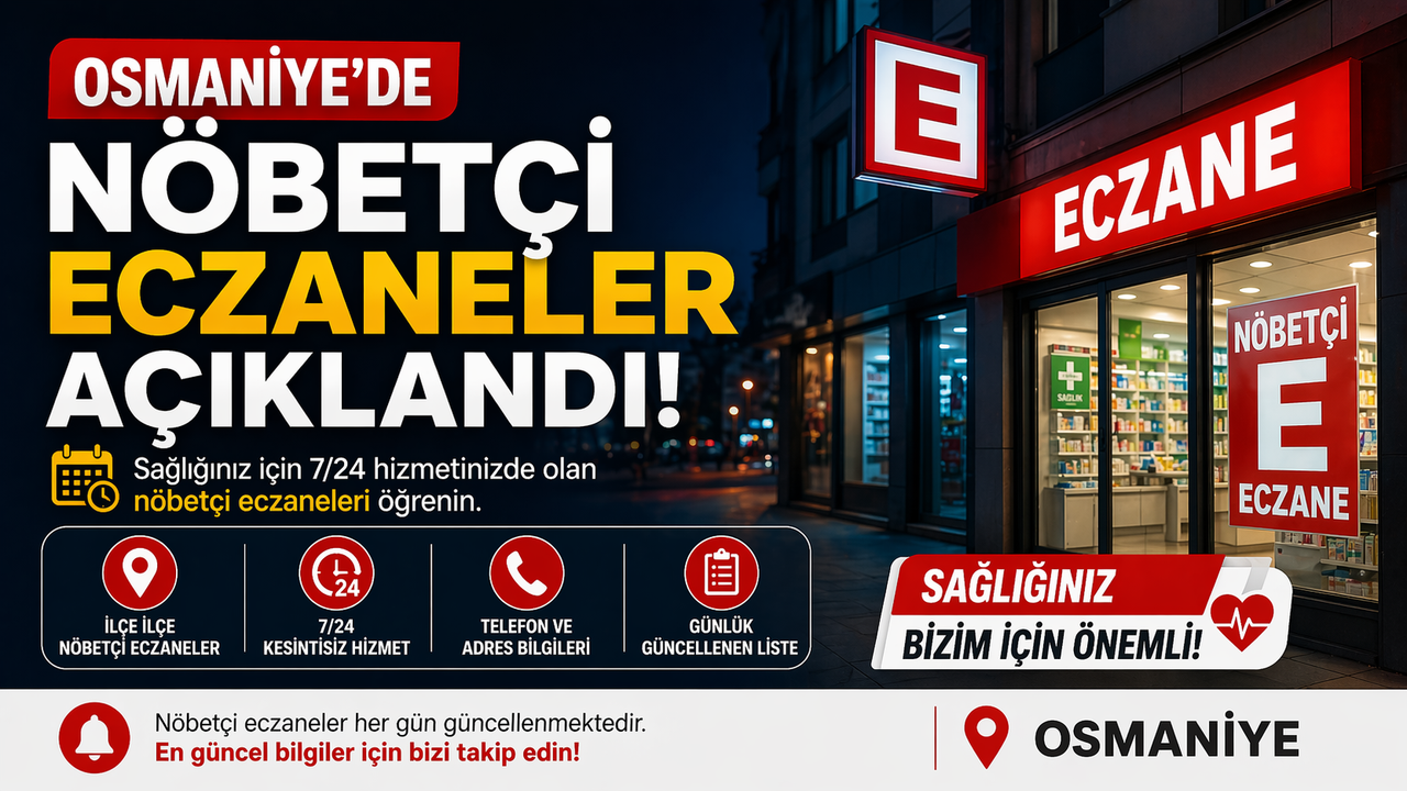 Osmaniye genelinde 24 Nisan 2026 Cuma günü hizmet verecek nöbetçi eczaneler belli oldu. Vatandaşların acil ilaç ihtiyaçlarını karşılayabilmesi için ilçe ilçe nöbetçi eczaneler açık olacak.