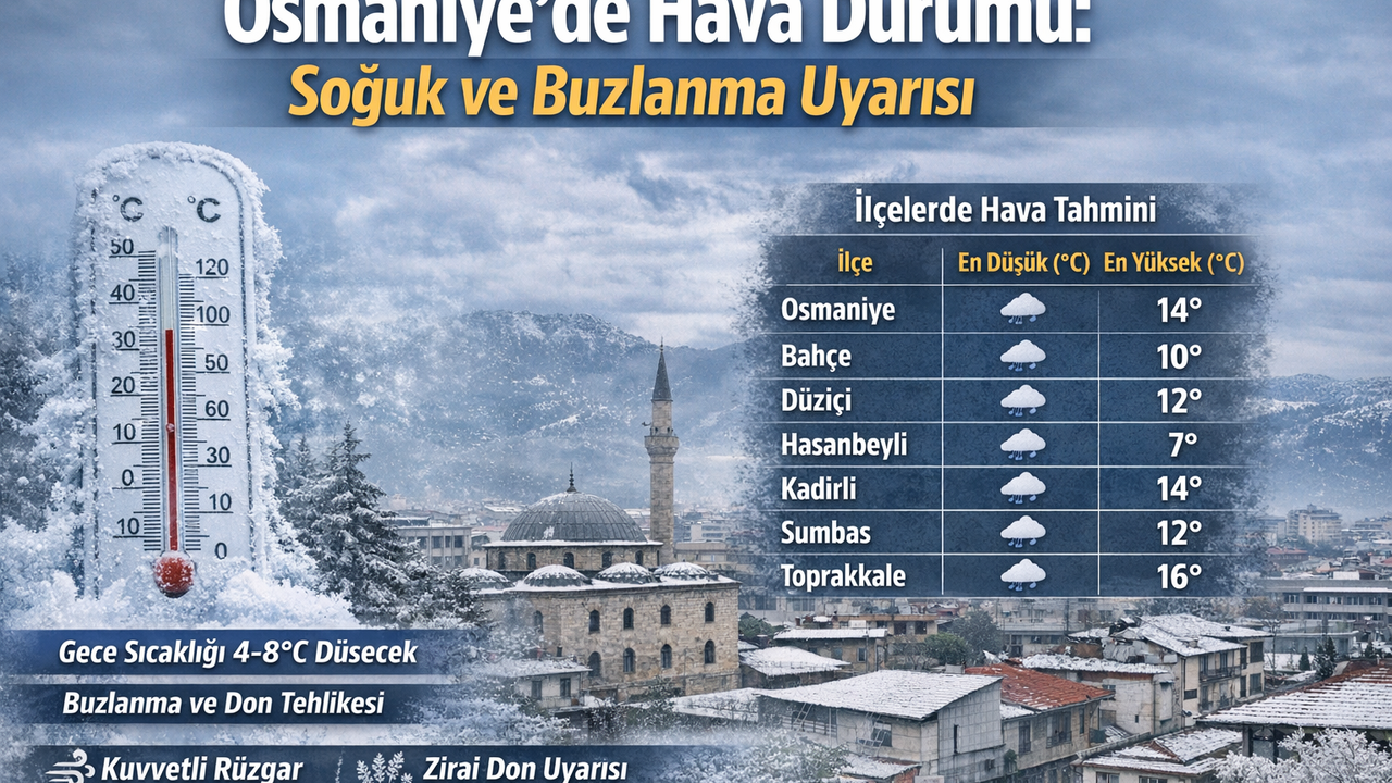 Meteoroloji Genel Müdürlüğü’nden alınan son verilere göre, Osmaniye ve ilçelerinde 27 Şubat 2026 Cuma gecesinden itibaren soğuk hava etkili olacak. Bölge genelinde gece sıcaklıklarının hissedilir derecede (4–8°C) azalması, özellikle sabah ve gece saatlerinde buzlanma ve don riskini artırıyor. Tarımsal faaliyetlerin sürdüğü alanlarda ürün kayıplarına karşı tedbirli olunması gerekiyor.