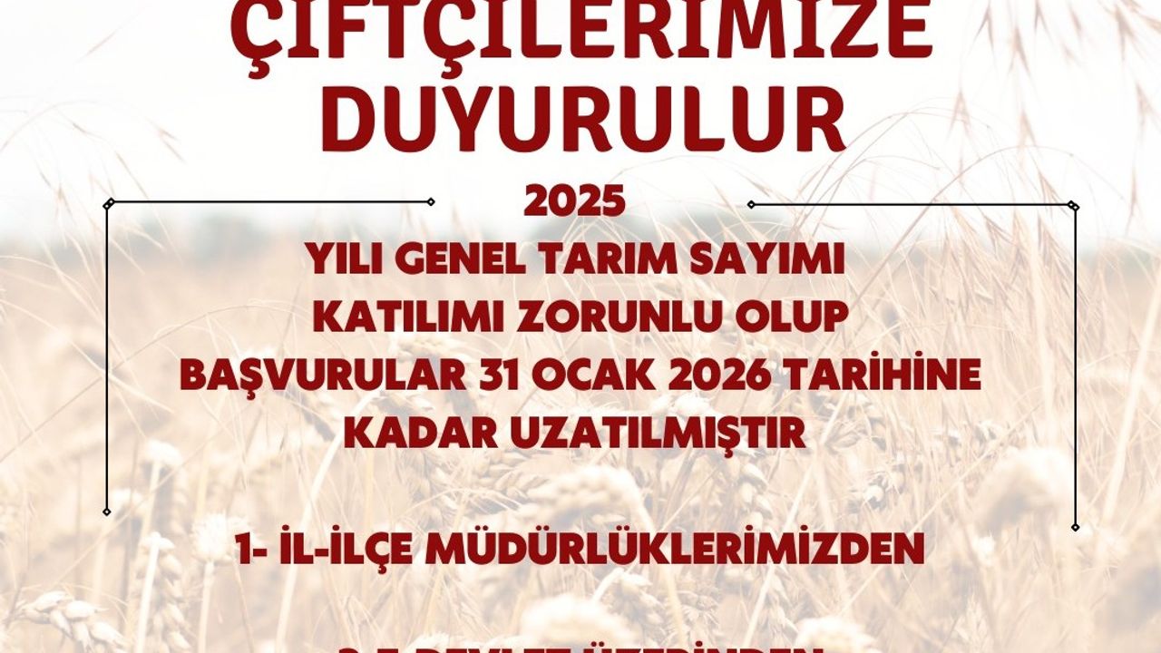 Osmaniye İl Tarım ve Orman Müdürlüğü, 2025 yılı Genel Tarım Sayımı katılım sürelerinin 31 Ocak 2026 tarihine kadar uzatıldığını açıkladı. T.C. Tarım ve Orman Bakanlığı yetkilileri İbrahim Yumaklı ve Erdem Kolabaş tarafından yapılan açıklamada, sayımın katılımının tüm çiftçiler ve tarım işletmeleri için zorunlu olduğu vurgulandı.