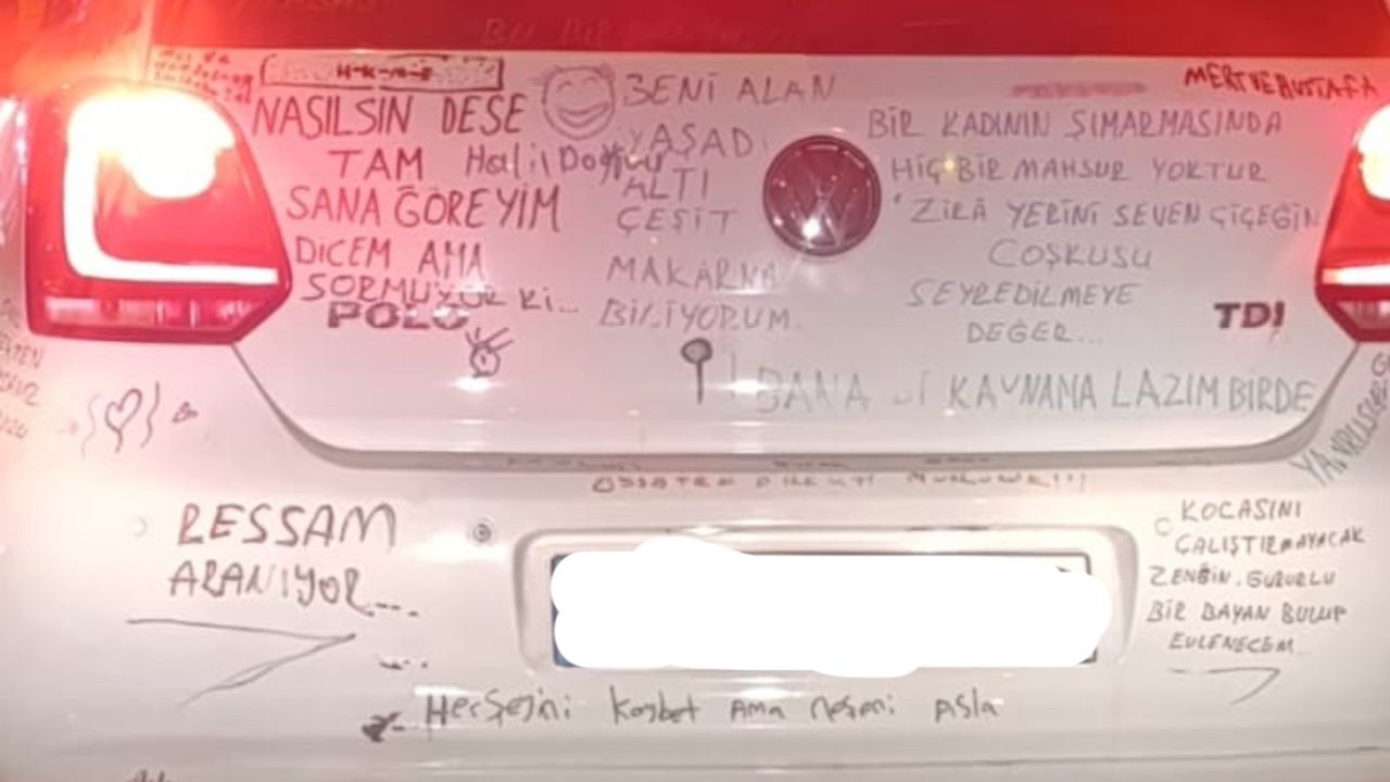 Osmaniye’de akşam saatlerinde trafikte seyreden bir otomobil, üzerine yazılan esprili notlarla dikkat çekti. Bagaj kapağından tamponuna kadar birçok yerine farklı cümleler yazılan aracın üzerinde, “Ressam aranıyor”, “Beni alan yaşadı”, “Bir kadının şımarmasında hiçbir mahsur yoktur” gibi ifadeler yer aldı.