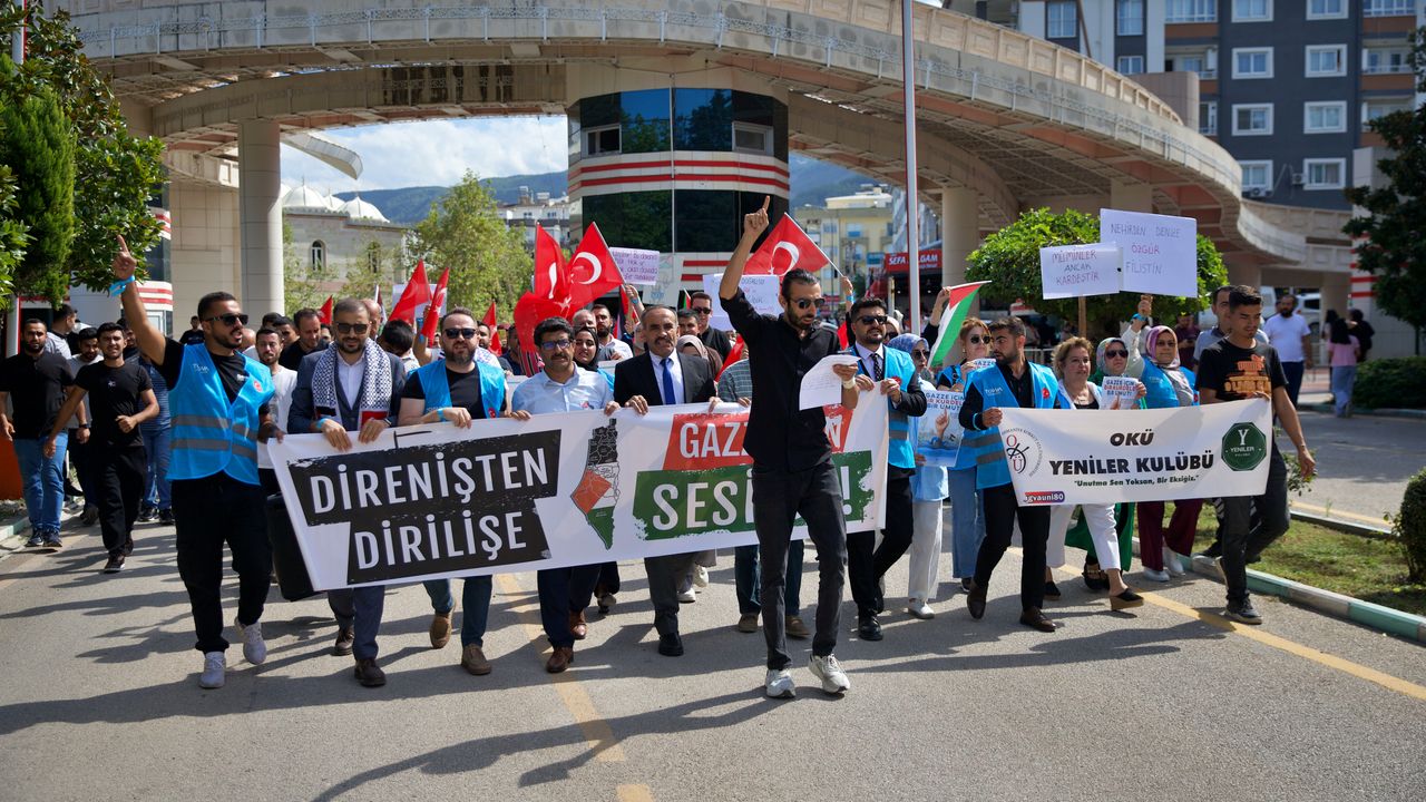OSMANİYE (AA) - Osmaniye Korkut Ata Üniversitesi (OKÜ) öğrencileri, İsrail'in Filistin'e yönelik saldırılarını protesto etmek amacıyla yürüyüş düzenledi.