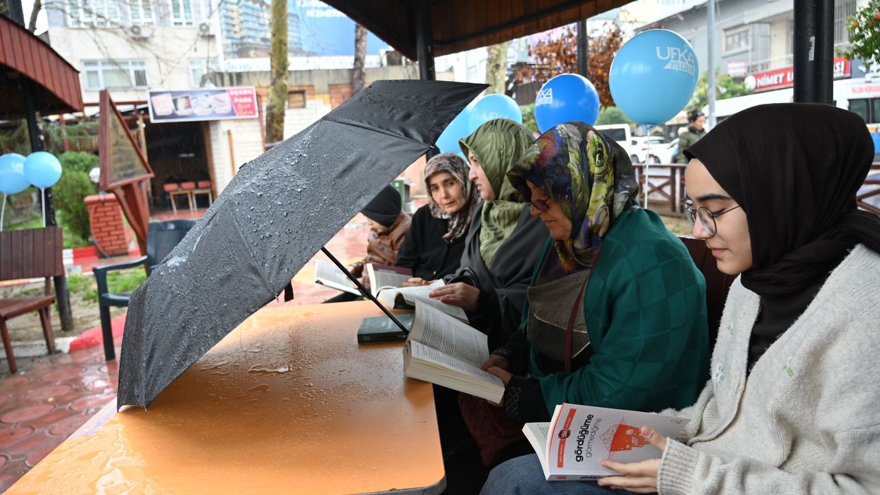 OSMANİYE (AA) - Osmaniye'nin Kadirli ilçesinde bir grup vatandaş, yağmurda şemsiye altında kitap okudu.