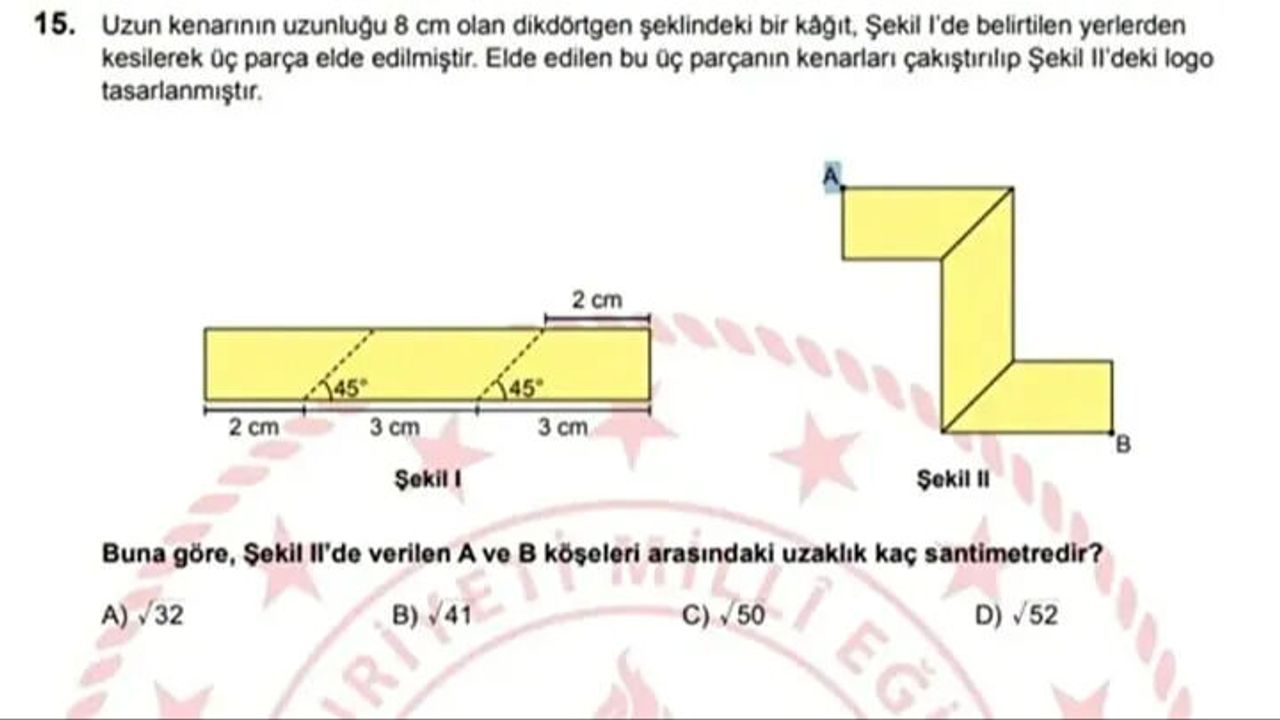 Matematik 15. soruda A ve B köşeleri arasındaki uzaklık hesaplanması isteniyor. Fakat soru metninde “en kısa uzaklık” ifadesinin bulunmaması ve uzaklığın cisim içinden mi yoksa dışından mı olduğu konusunda açıklamanın olmaması nedeniyle, sorunun birden fazla doğru cevabı olabileceği iddia edildi. Uzmanlar, B, C ve D şıklarının tamamının doğru kabul edilmesi gerektiğini savunuyor.