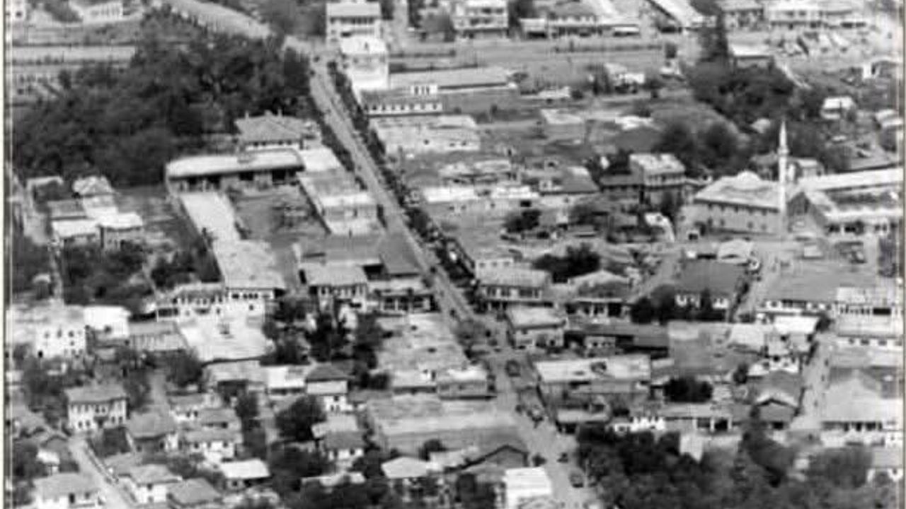 Fotoğrafın ortasında uzanan cadde Dr. Ahmet Alkan Caddesi, bitiminde ise İstasyon (şimdi Hasan Çenet) Caddesi başlıyor. Sol tarafta görülen yeşil alan, günümüzde Şehit Albay Halil İbrahim Karaoğlanoğlu Parkı olarak biliniyor. Parkın ilerisinde, yıkılıp yerine 10 katlı özel idare işhanı yapılan ilk kaymakamlık binası yer alıyordu; o işhanı da daha sonra yıkılmıştı. Şimdiki Devlet Bahçeli Meydanı o alanın bir parçası.