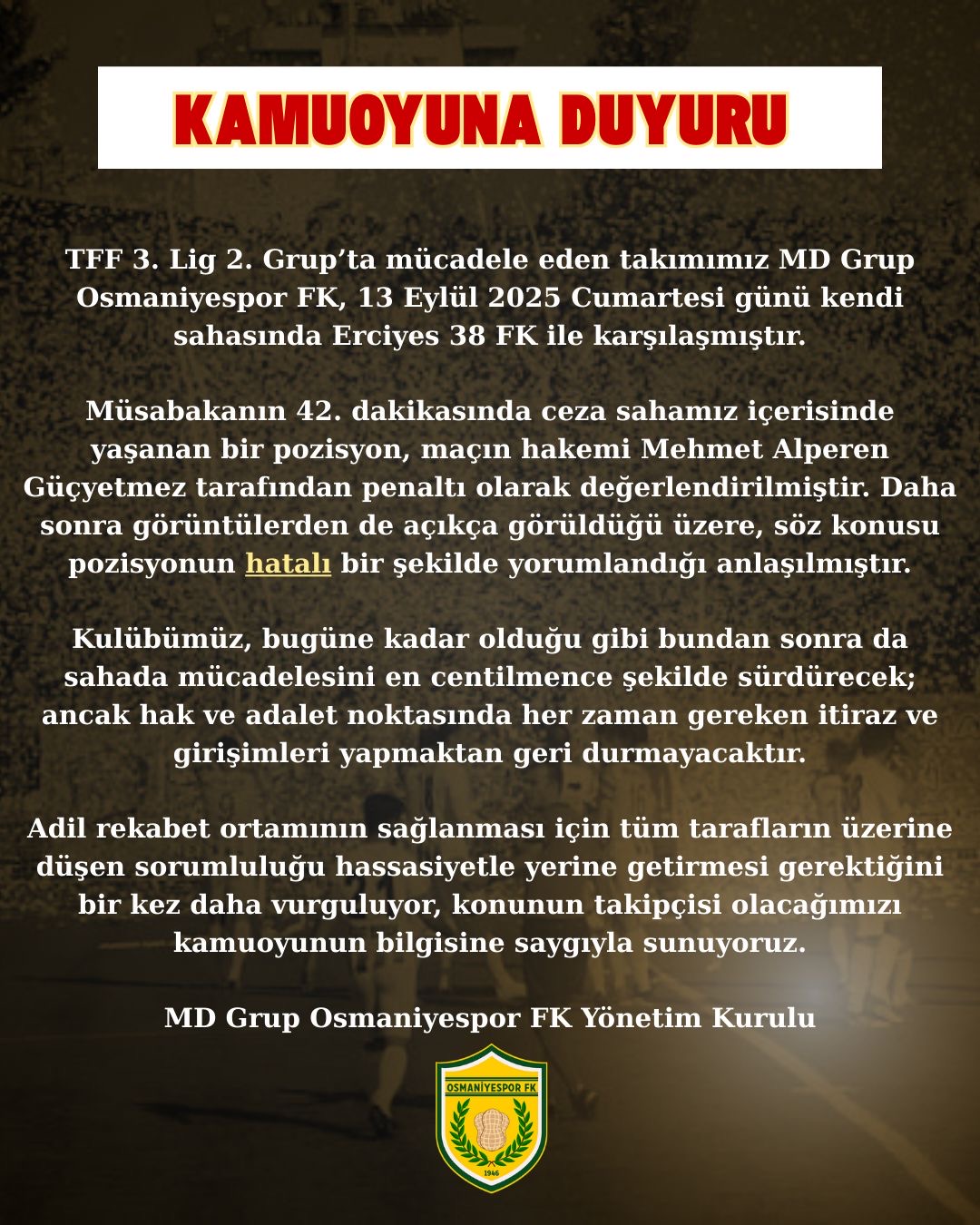 TFF 3. Lig 2. Grup’ta mücadele eden MD Grup Osmaniyespor FK, 13 Eylül 2025 Cumartesi günü kendi sahasında Erciyes 38 FK ile karşı karşıya geldi. Mücadelede yaşanan bir pozisyonla ilgili kulüp yönetiminden kamuoyuna açıklama yapıldı.