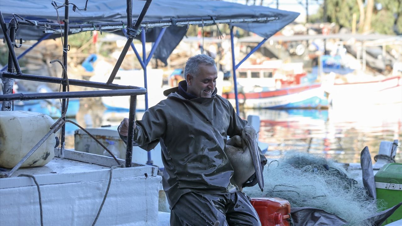 İstiklal Mahallesi'ndeki balıkçı barınağına 6 Şubat 2023'te meydana gelen depremlerin ardından konan pelikana, 50 yaşındaki balıkçı Tekin Uçar yardım eli uzattı.