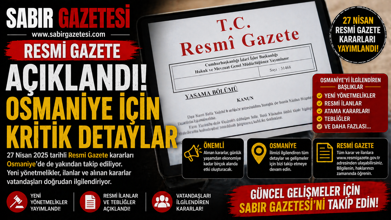 Resmi Gazete’de yayımlanan 27 Nisan tarihli kararlar, Türkiye genelinde olduğu gibi Osmaniye’de de yakından takip ediliyor. Yeni yönetmelikler ve ilanlar, özellikle eğitim ve kamu süreçlerinde doğrudan etki oluşturabilecek gelişmeler içeriyor.