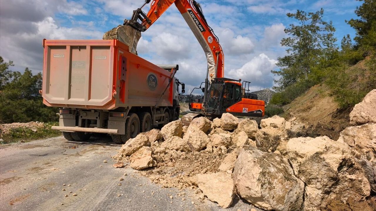MERSİN (AA) - Mersin'in Tarsus ilçesinde sağanak nedeniyle yola düşen kaya parçaları, iş makinesiyle kaldırıldı.