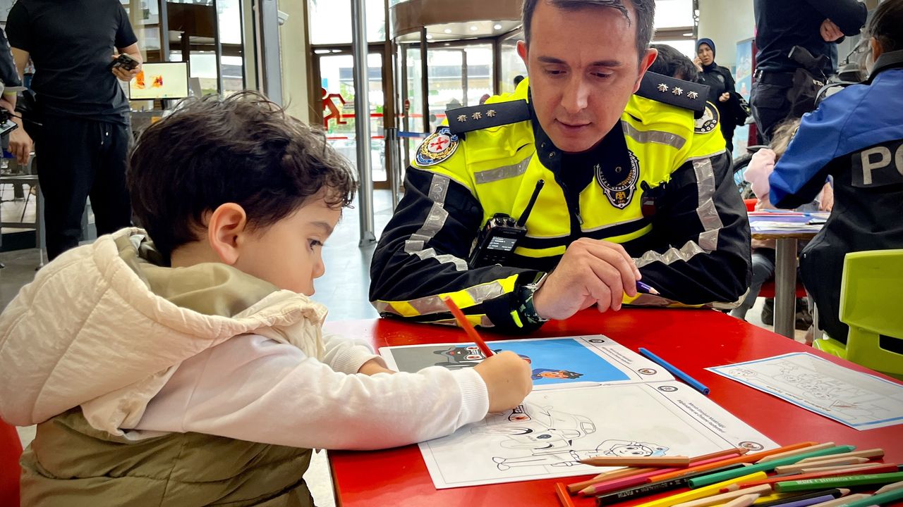 Etkinlikte temel trafik eğitimi verilen çocuklar polislerle boyama da yaptı.