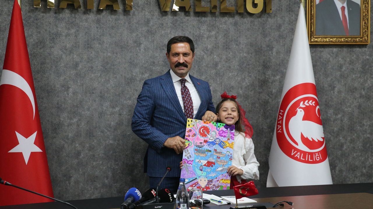 HATAY (AA) - Hatay Valisi Mustafa Masatlı, TEKNOFEST Mavi Vatan Resim Yarışması'ndaki İlkokul kategorisinde Türkiye birincisi olan Asya Alyanak'a takdir plaketi verdi.