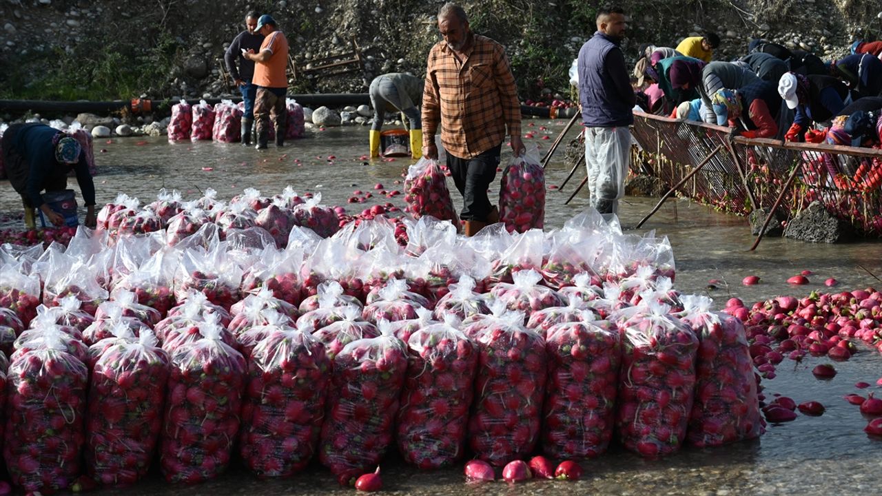 OSMANİYE (AA) - MUZAFFER ÇAĞLIYANER - Osmaniye'de coğrafi işaret tescilli Kadirli turpunda hasada başlayan çiftçiler, tüketicilere ulaştıracakları ürünleri çamurdan arındırmak için Savrun Çayı'nın soğuk suyunda el birliğiyle çalışıyor.