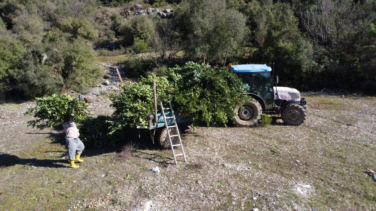 Kırsal mahalle sakinleri, dik yamaçlardaki ağaçlardan topladıkları defne yapraklarını traktör römorklarına yükleyip meydana taşıyor.