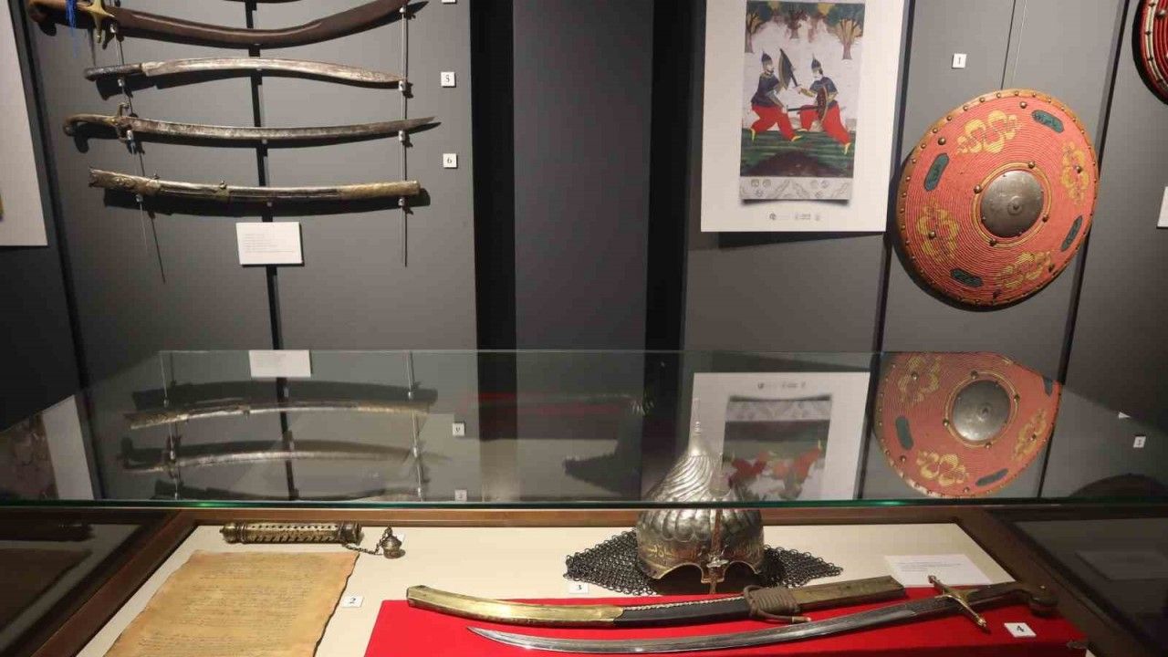 Eskişehir’de 158 eser ilk defa ziyaretçilerle buluştuğu ‘Alp Ruhu, Bilge Akıl: Türk Savaş Sanatları Sergisi’nde yer alan Osman Gazi adına okutulan ilk hutbenin orijinal metni, Orhan Gazi’nin miğferi ve Mihalgazi’nin kılıcı dikkat çekti.