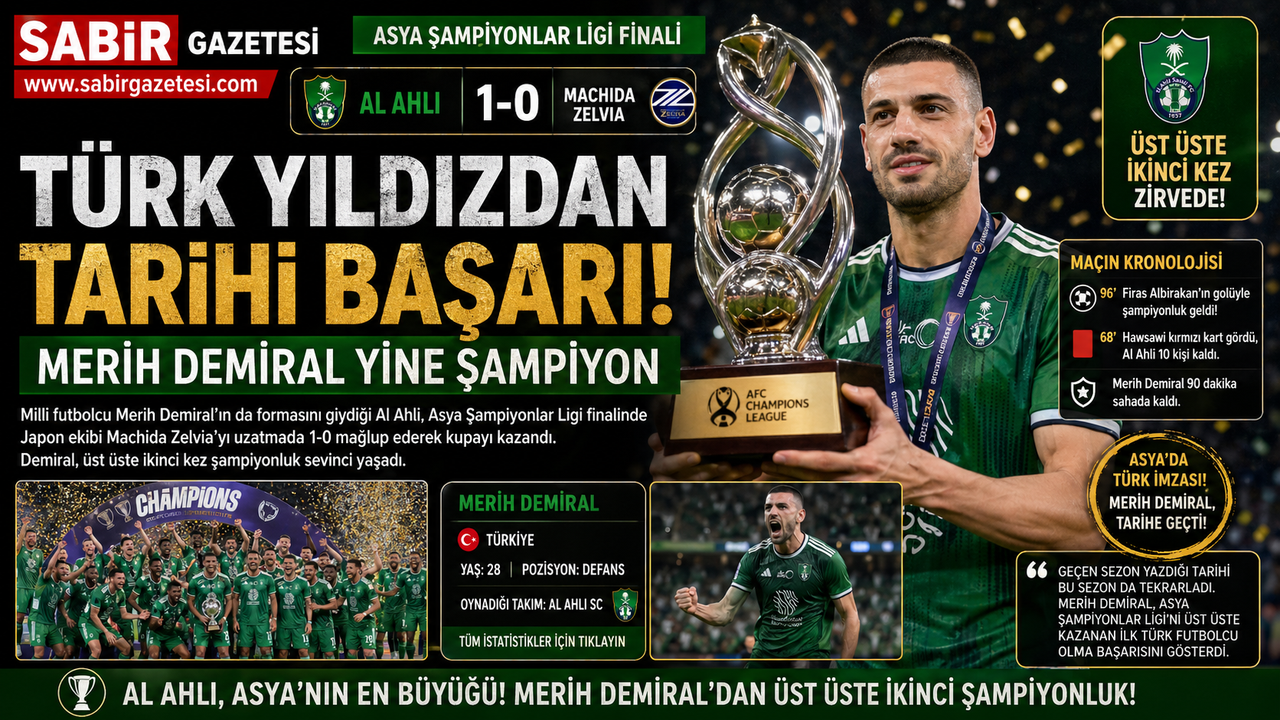 Milli futbolcu Merih Demiral, Asya Şampiyonlar Ligi’nde bir kez daha tarih yazdı. Suudi Arabistan temsilcisi Al Ahli, finalde Japon ekibi Machida Zelvia’yı 1-0 mağlup ederek kupayı kazandı. Bu sonuçla Demiral, üst üste ikinci kez şampiyonluk sevinci yaşadı.