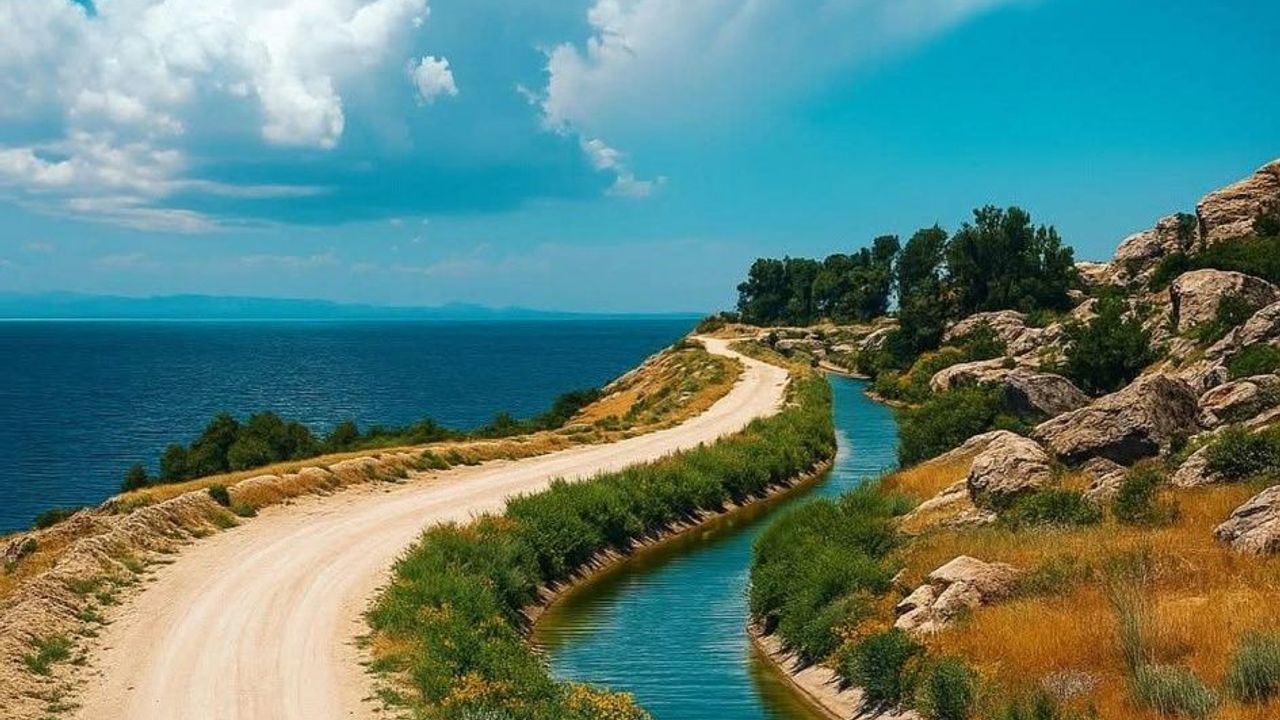 Görselde de açıkça görüldüğü gibi, Şamran Kanalı’nın çevresinde uzanan kıvrımlı toprak yol, suyla birlikte adeta doğayla dans ediyor. Bir tarafında gökyüzüne yükselen pamuksu bulutlar, diğer tarafında ise Van Gölü'nün derin maviliği, bu coğrafyayı adeta kartpostal güzelliğinde bir sahneye dönüştürüyor.