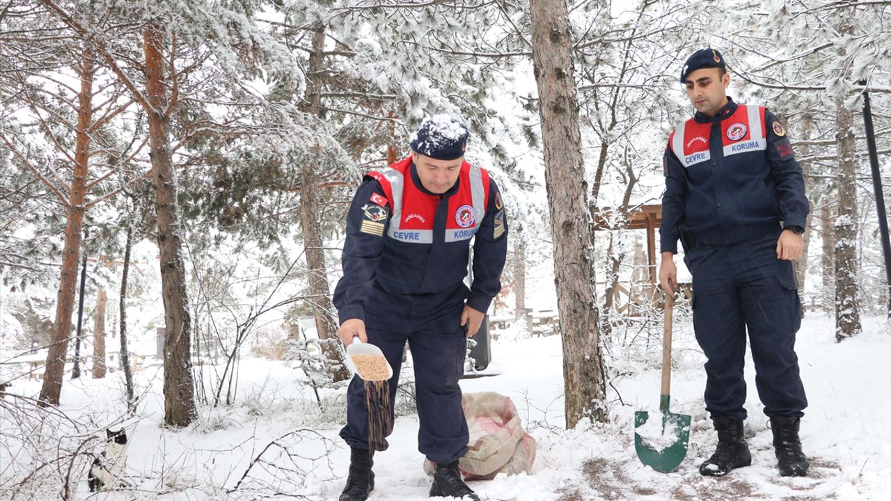 İl Jandarma Komutanlığı Çevre, Doğa ve Hayvanları Koruma Timi, kentte etkili olan kar yağışı nedeniyle yiyecek bulmakta zorluk çeken yaban hayvanları için harekete geçti.